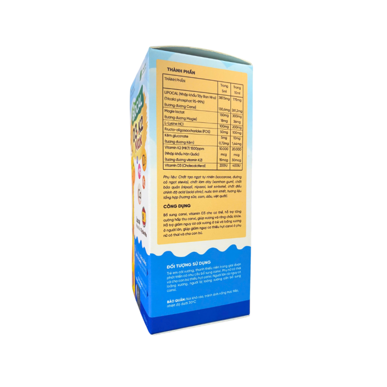 Sản phẩm kết hợp Vitamin D3 và Vitamin K2 (MK7 siêu tinh khiết – nhập khẩu Hàn Quốc) cùng Magie, Kẽm, L-Lysin và FOS, giúp tối ưu hóa hấp thu canxi, hỗ trợ phát triển xương răng, giảm còi xương ở trẻ và cải thiện sức khỏe xương ở người lớn.