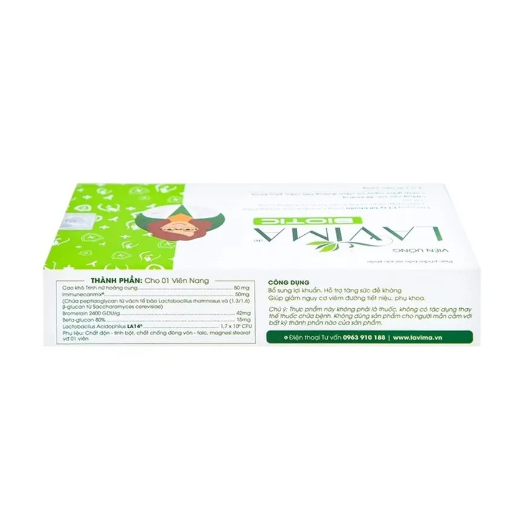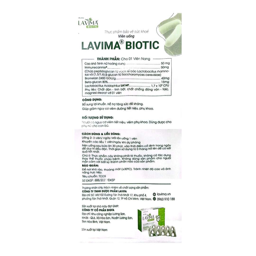 Lavima® Biotic là viên uống bổ sung lợi khuẩn kết hợp thảo dược, giúp tăng sức đề kháng, cân bằng hệ vi sinh vùng kín và giảm viêm nhiễm phụ khoa, viêm tiết niệu. Phù hợp với phụ nữ mọi độ tuổi, kể cả mẹ cho con bú.