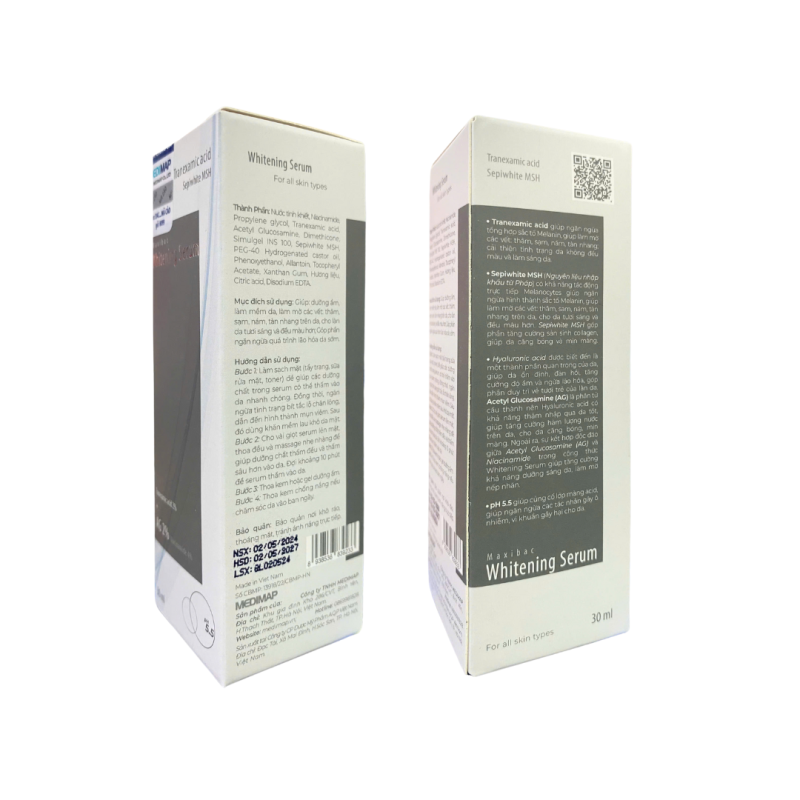 Maxibac Whitening Serum – Serum trị nám dưỡng trắng da Maxibac giúp dưỡng sáng, làm mờ các vết: thâm, sạm, nám, tàn nhang; cải thiện tình trạng da không đều màu. Hỗ trợ tăng cường sản sinh collagen, giúp da căng bóng và mịn màng, giảm nếp nhăn hiệu quả.