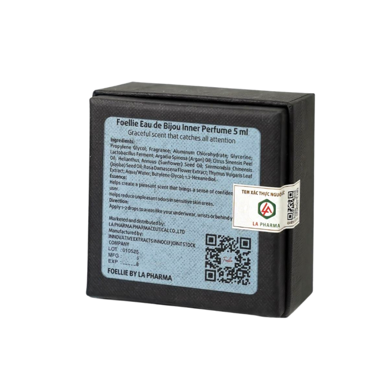 Foellie Eau de Bijou Inner Perfume 5 ml (màu đen) là nước hoa vùng kín dạng giọt, mang hương thơm mềm mại – quyến rũ nhưng kín đáo. Mùi hương mở đầu ngọt ngào của cam, mật ong và vanilla; chuyển sang nồng nàn của dành dành, linh lan, ngọc lan tây, nhài; kết lại sâu lắng với gỗ đàn hương, hoắc hương, xạ hương, dừa và vanilla. Công thức chứa Lactobacillus Ferment cùng tinh dầu thực vật (argan, jojoba, hướng dương, vỏ cam) giúp làm dịu làn da nhạy cảm và hỗ trợ cân bằng hệ vi sinh – pH, mang lại cảm giác sạch sẽ, dễ chịu. Thiết kế nhỏ gọn, dùng 1–2 giọt vào đáy quần lót hoặc chấm tại các điểm mạch như một loại nước hoa body, phù hợp cho mọi ngày bạn muốn tự tin và thu hút.