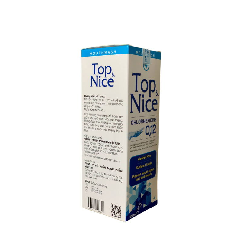 Nước súc miệng TOP & NICE với 0,12% Chlorhexidine – nồng độ đạt chuẩn quốc tế, giúp làm sạch khoang miệng, giảm vi khuẩn gây hại và hỗ trợ phòng ngừa virus. Sản phẩm có khả năng kháng khuẩn vượt trội: ở nồng độ thấp giúp ức chế vi khuẩn, còn ở nồng độ cao tiêu diệt hoàn toàn và ngăn ngừa chúng quay trở lại.