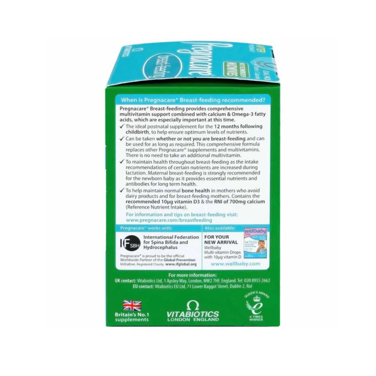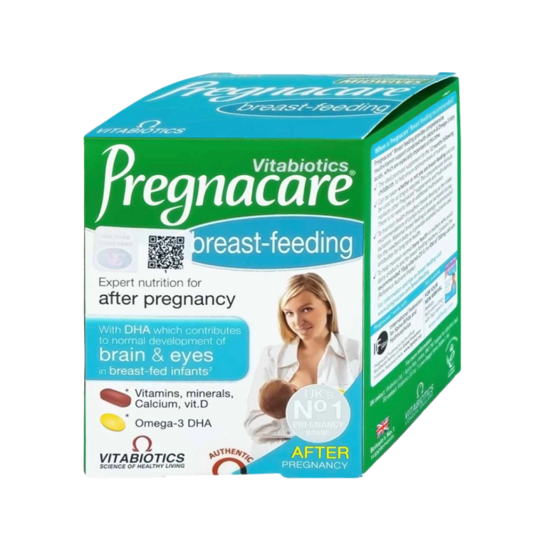 Pregnacare Breast-feeding là viên uống dành riêng cho phụ nữ sau sinh và cho con bú. Công thức chứa vitamin, khoáng chất, DHA và EPA giúp mẹ phục hồi sức khỏe, tăng sức đề kháng, đồng thời cải thiện chất lượng sữa, hỗ trợ phát triển não bộ, thị giác và miễn dịch cho bé.