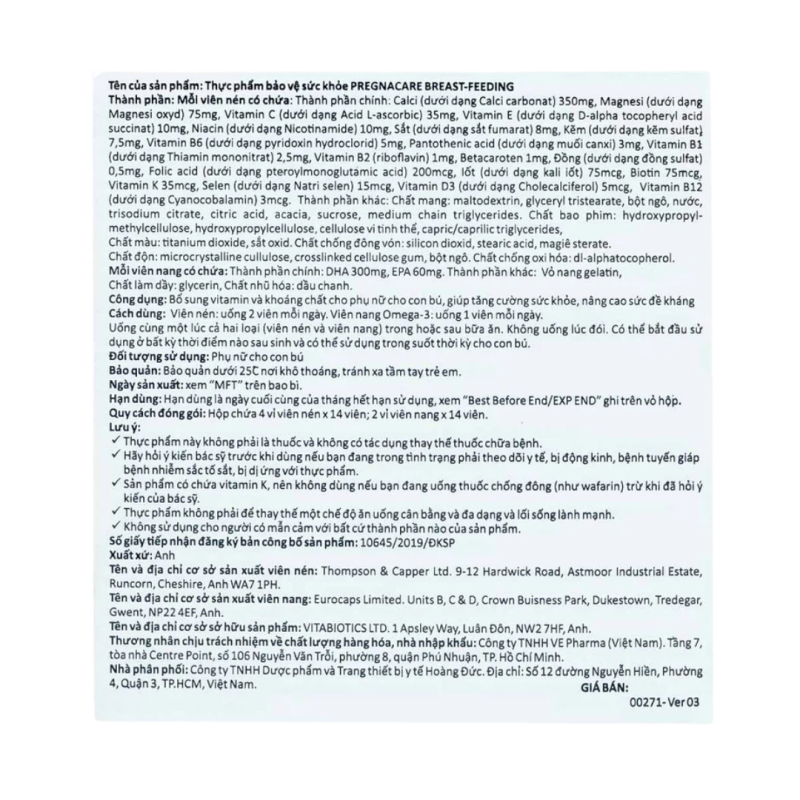 Pregnacare Breast-feeding bổ sung vitamin và khoáng chất cho phụ nữ cho con bú, giúp tăng cường sức khỏe, nâng cao sức đề kháng.