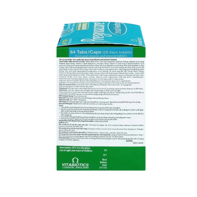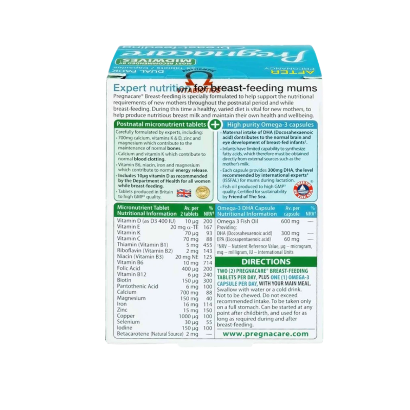 Pregnacare Breast-feeding là viên uống dành riêng cho phụ nữ sau sinh và cho con bú. Công thức chứa vitamin, khoáng chất, DHA và EPA giúp mẹ phục hồi sức khỏe, tăng sức đề kháng, đồng thời cải thiện chất lượng sữa, hỗ trợ phát triển não bộ, thị giác và miễn dịch cho bé.